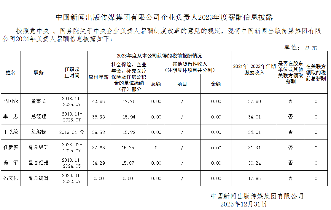 中国新闻出版传媒集团有限公司企业负责人2023年度薪酬信息披露