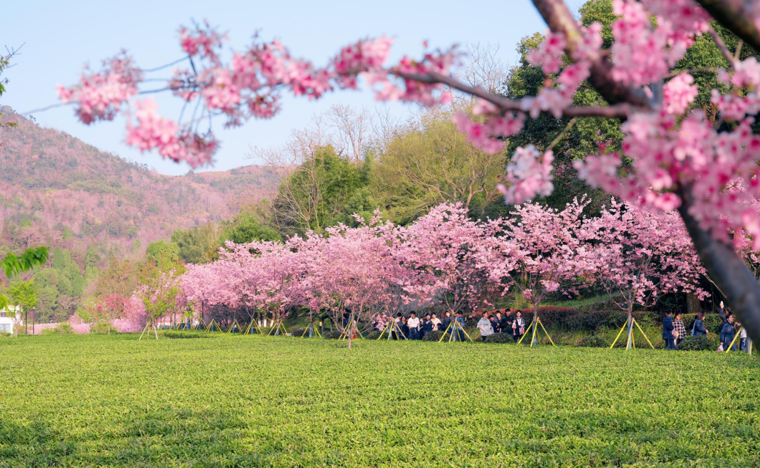 在浙江省乐清市大荆镇下山头村,山间樱花烂漫盛放,与青翠山林相映成趣,村民与游客漫步其间、踏青赏景,一幅村美人和、岁月静好的温馨图景呈现眼前。