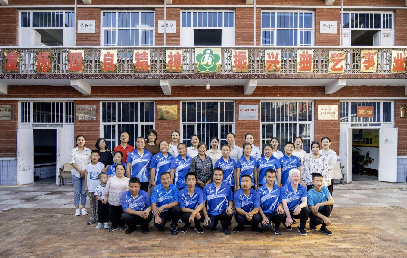 “文明中国”主题采访报道组与陵川县盲人曲艺宣传队合影。李剑琦摄