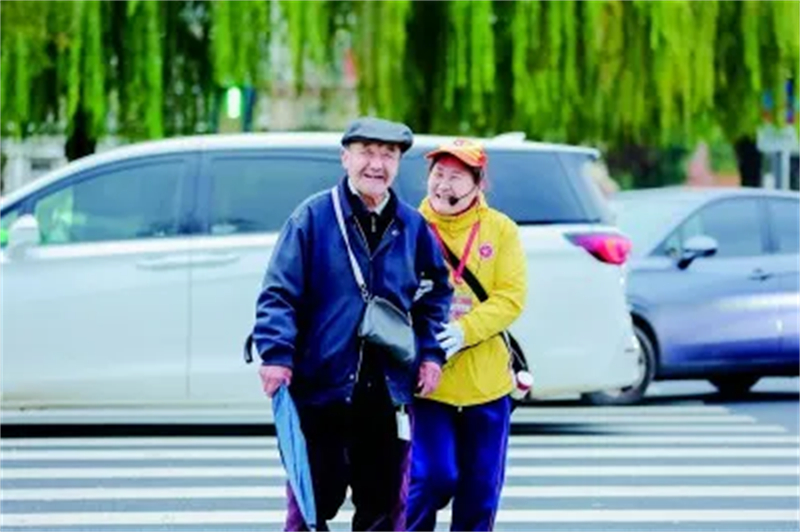 文明引导员帮助老年人过马路。